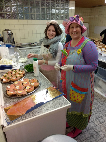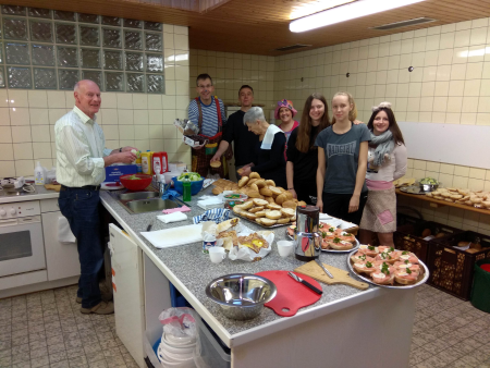 Bereits am frühen Nachmittag trafen sich acht „Schmierer“, um unter der gekonnten Anleitung von Küchen-Fee Andrea Lachsbrötchen, Schnitzelbrötchen, Mettbrötchen usw. liebevoll vorzubereiten. Dass es nicht nur „harte Arbeit“ war, die die fleißigen Helfer an diesem Samstag zu verrichten hatten, sieht man auf den Fotos.
