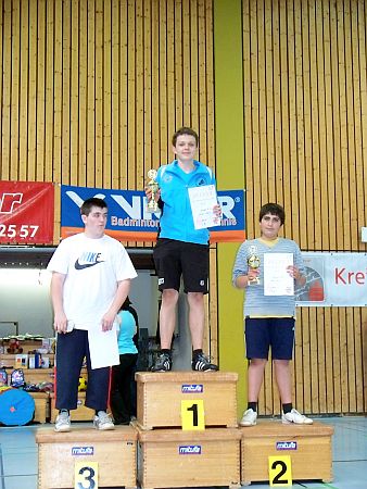 Bei U13 gelang dies Selina (16 Meldungen) gut, konnte Sie doch alle Ihre Spiele gewinnen, bis auf das Spiel gegen ihre Angstgegnerin Jenny Kuhfs (Westerburg). Dennoch belegte sie am Ende einen guten 3. Platz! Auch Daniel K. hätte sich unter die ersten Drei platzieren können, wenn er sich bei seinem zweiten Spiel kein Eigentor geschossen hätte. Führte er doch im Satz mit 11, so meinten dann beide man müsse nun zwei Gewinnsätze bis 11 spielen…. Letztlich unterlag Daniel K., im für dieses Turnier einmaligem Spiel, im dritten Satz, so dass er als Zweitplatzierter seiner Gruppe am Ende den undankbaren 9. Platz belegte. Marco konnte seinen Erwartungen gerecht werden, verlor er lediglich in der Vorrunde gegen den z. Zt. unschlagbaren Florian Münch und das vereinsinterne Duell gegen Daniel K.. Am Ende konnte er den 11. Platz bei insgesamt 28 Meldungen belegen.