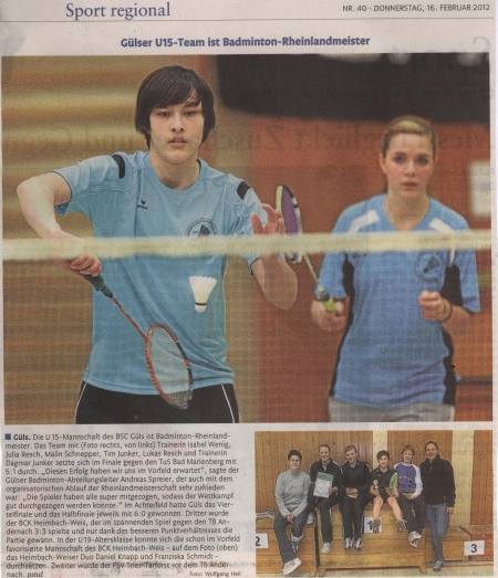 Damit kann sich, zumindest seit den letzten 12 Jahren, eine Nachwuchsmannschaft des BCK als Rheinlandmeister in der Liste der ewigen Sieger des BVR eintragen. Der Glückwunsch geht an alle MannschaftsspielerInnen der 1. und auch der 2. Mannschaft, die heute leider nicht alles zeigen und geben konnte.