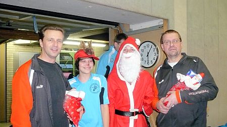 Bevor es überhaupt losging, kam der Weihnachtsmann mit „Rudi“ auf einen Sprung vorbei. Doch dieses mal wurden nicht die Kinder, sondern die beiden Betreuer Mario und Helmut mit einer kurzen Laudatio und einer mehr als kleinen Aufmerksamkeit bedacht. Der Dank kam von den KaderspielerInnen für das langjährige Engagement beider Betreuer, die angenehm überrascht ihre Geschenke entgegen genommen hatten.