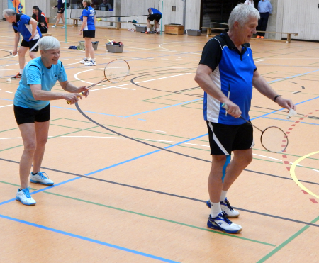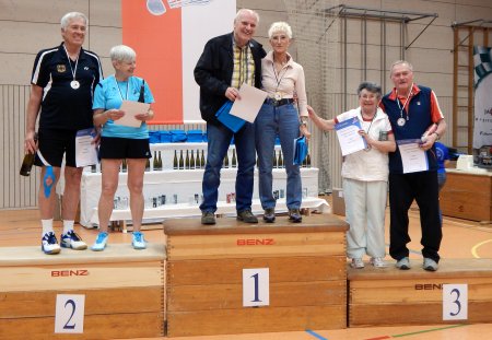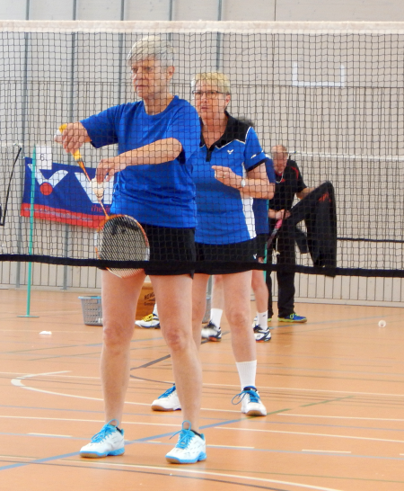Hier trat Marlies gemeinsam mit Dieter Prax in der Altersstufe O70 in einem Viererfeld an. Die erste Paarung aus Hessen bereitet den beiden Rheinländern keine Probleme, nach dem knappen 1. Satz mit 21:18, war Marlies warmgelaufen und so gewannen beide den 2. Satz deutlich mit 21:8.