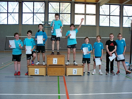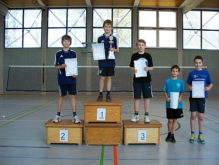 Das größte Teilnehmerfeld stellten die JU15 mit neun Meldungen. Zunächst wurde in zwei Gruppen mit zwei Gewinnsätzen bis 15 gespielt und anschließend über Kreuz die Platzierungen mit zwei Gewinnsätzen bis 21. In der Gruppenphase dominierten jeweils Paul Schneider und Christian Knue, die sich dann auch im Finale gegenüberstanden. Hier setzte sich Christian mit 21:11 und 21:12 durch.
