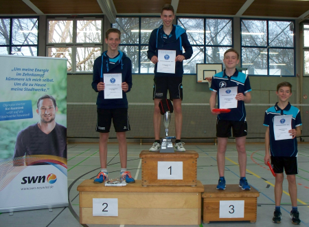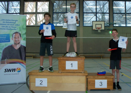 Auch zwei mal traten die JU15 in einer Gruppe gegen einander an. Ohne Satzverlust holte sich Samuel den Meistertitel, Paul kam mit einem ausgeglichen Punktestand auf Platz 2 gefolgt von Tom.