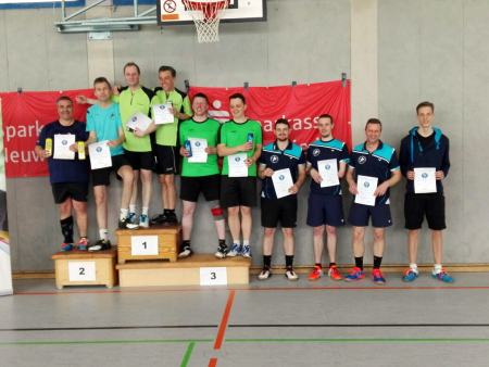 Im Herrendoppel traten 9 Paarungen an, die sich teilweise lange und nervenaufreibende Ballwechsel lieferten. Erwartungsgemäß setzten sich hier die Herren aus der zweiten Seniorenmannschaft in den Vorrunden durch und trafen in der Finalrunde aufeinander. Hier hatten letztlich Michael Kahn und Günter Fabritius nach 3 Sätzen das bessere Ende für sich und setzten sich verdient mit 21:17 / 12:21 / 21: 15 vor den Vizemeistern Claus Schröder und Volker Schäfer durch. Auf den dritten Platz hatten sich Jasper Neese und Peter Bleidt gekämpft.